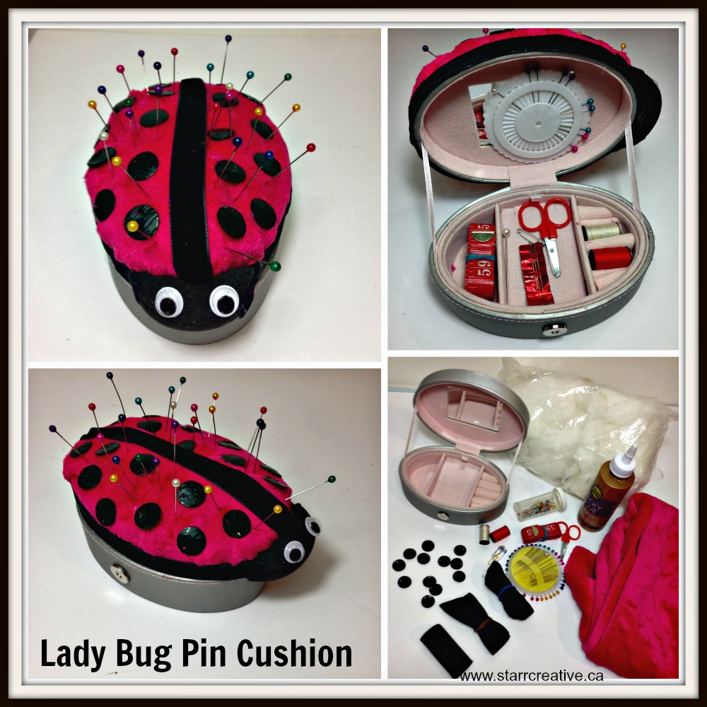I am seeing a raku lady bug in the future! (with firings and such, I think we won’t see her for a month!) Thanks for including me in this and I love what you did! What a perfect box to upcycle for a pin cushion. I really love the fact the pin cushion had storage too!