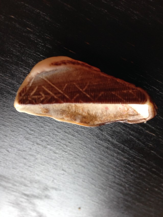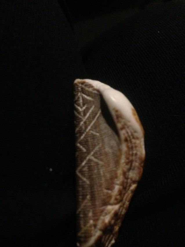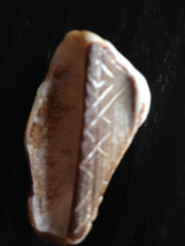 I was just about to toss it to the side, when I noticed something peculiar! It almost appeared as if the shell had grown onto or around a small piece of what looks like petrified wood. I’m no expert by any means but this little thin smooth brown edge does makes the ting sound that petrified wood makes or it could just be a natural growth aspect of the odd shaped well-worn remains of a shell. I was interested in how the shell seemed to have grown around it and then I realized there were marking on it. I went and got my glasses to be sure I was actually seeing what I thought I was seeing. You can imagine my surprise! There it was, a tiny little message. Who carved this or wrote this and when?