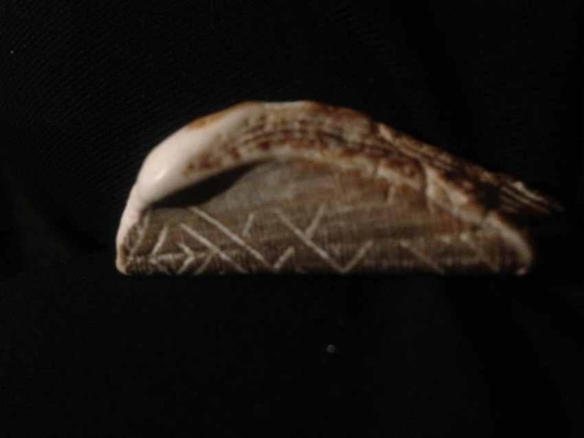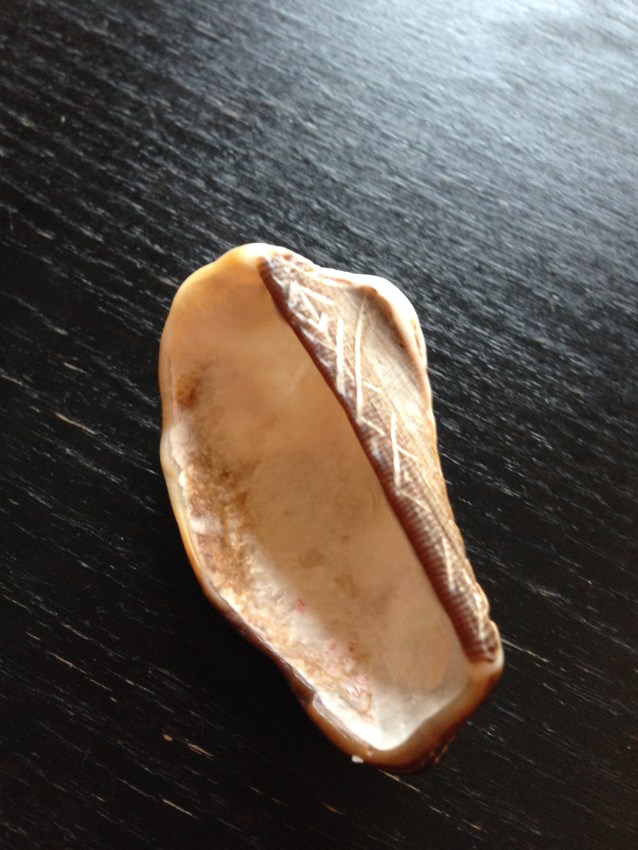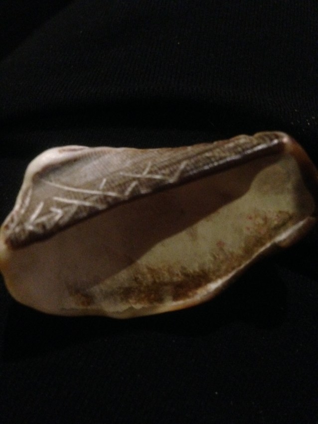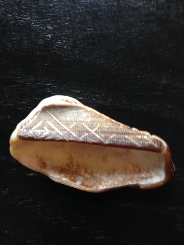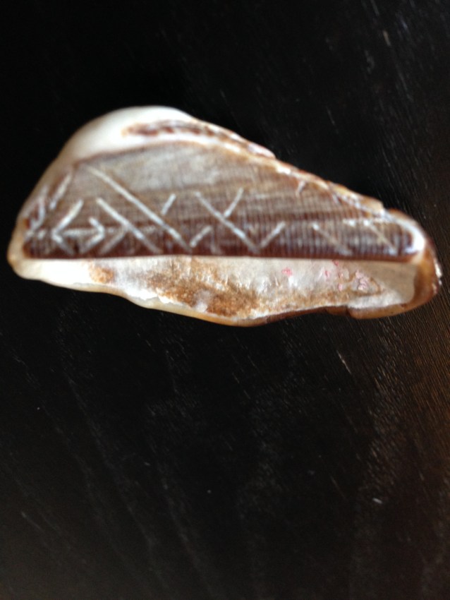 This shell reminds me of some of the shells I see here in Arizona. They have carvings in them as well and turquoise along with other stones from around this area. The natives used to trade back and forth with other tribes. In Arizona we don’t really have places for shells (except tiny ones by the water canels the natives built a long time ago) anyway, this shell looks similar to that but I can’t remember if they used wood or craved into the shell. Next time I get a chance to visit one of our museums I will try to get a photo for you. Might be hard though because they keep everything protected behind glass. What a great find. Make sure you put that one away somewhere safe.